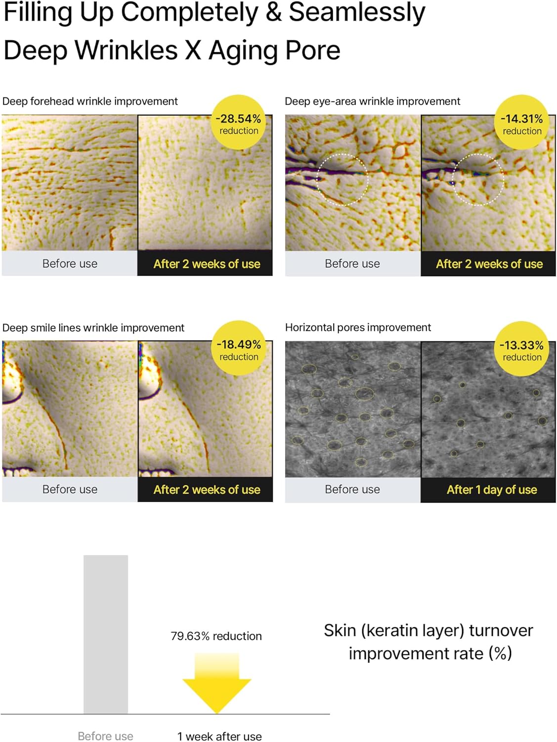 - Formulating a high concentration of 0.1% Nano-sized retinal, 5 times smaller than pores and stabilized by liposome technology, aiding in more effective inner elasticity care